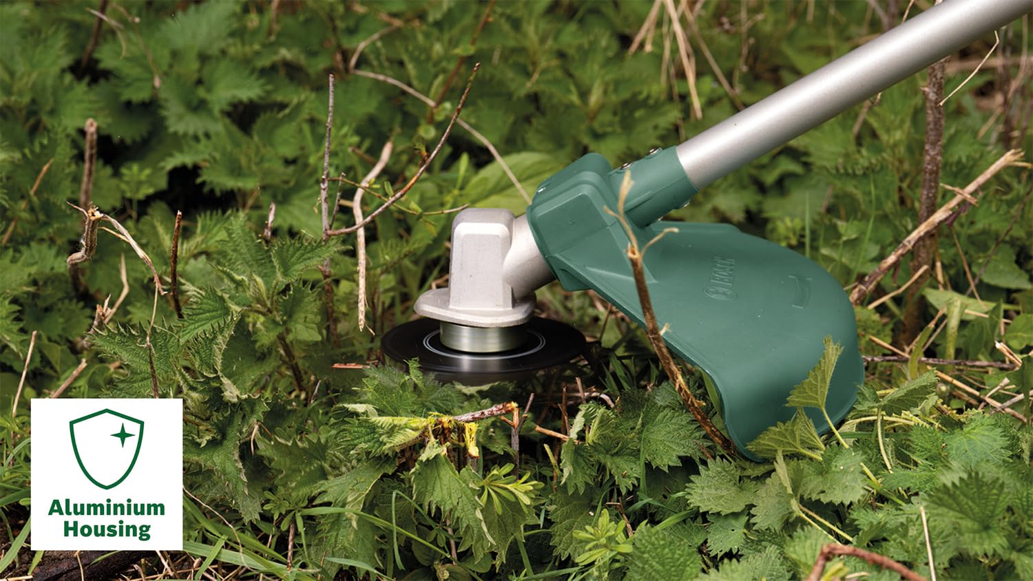 - Einfacher Wechsel zwischen Messer und Schneidfaden für große Flächen oder hartnäckigen Wildwuchs